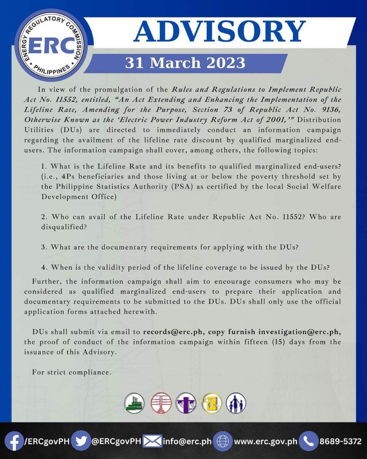 ERC ADVISORY on availment of lifeline rate discount as per RA 11552